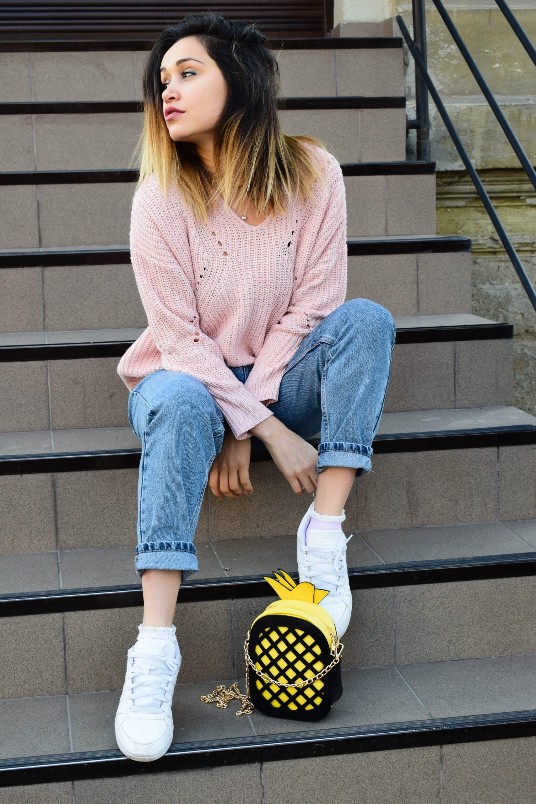 I was wearing my pineapple bag from Sammydress and my lovely blouse from Rosegal, Pull&Bear mom jeans, Addidas sneakers and Takko scarf